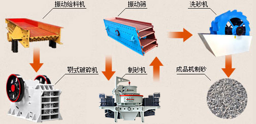 機(jī)制砂生產(chǎn)由原料預(yù)處理系統(tǒng)、計量中控系統(tǒng)、粉合系統(tǒng)、包裝系統(tǒng)、收塵系統(tǒng)五大系統(tǒng)組成,采用干法生產(chǎn)工藝,包括給料、碎石與機(jī)制砂整形、級配調(diào)整、篩分、砂粉分離、粉塵收集、輸送、電氣控制等工作模塊,主要設(shè)備包括GZD振動給料機(jī)、PE顎式破碎機(jī)、5X制砂機(jī)、XSD洗砂機(jī)、MC除塵器、YZS振動篩、KX選粉機(jī)、B皮帶輸送機(jī)、砂石粉分離機(jī)、電控系統(tǒng)等,可以對入料尺寸為50mm以下各種巖石顆粒進(jìn)行加工整形,獲得符合一定比例要求和相關(guān)質(zhì)量要求的精品碎石和精品機(jī)制砂。