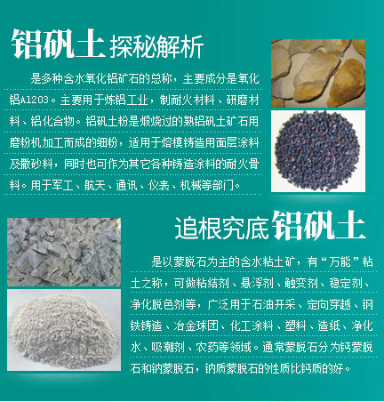 是多種含水氧化鋁礦石的總稱,主要成分是氧化鋁Al2O3。主要用于煉鋁工業(yè),制耐火材料、研磨材料、鋁化合物。鋁礬土粉是煅燒過(guò)的熟鋁礬土礦石用磨粉機(jī)加工而成的細(xì)粉,適用于熔模鑄造用面層涂料及撒砂料,同時(shí)也可作為其它各種鑄造涂料的耐火骨料。用于軍工、航天、通訊、儀表、機(jī)械等部門。