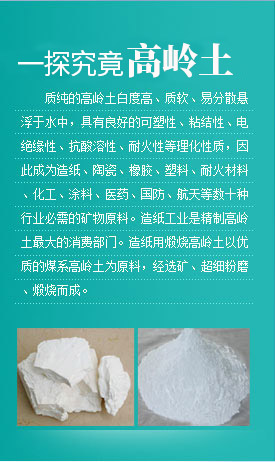 質(zhì)純的高嶺土白度高、質(zhì)軟、易分散懸浮于水中,具有良好的可塑性、粘結(jié)性、電絕緣性、抗酸溶性、耐火性等理化性質(zhì),因此成為造紙、陶瓷、橡膠、塑料、耐火材料、化工、涂料、醫(yī)藥、國(guó)防、航天等數(shù)十種行業(yè)的礦物原料。造紙工業(yè)是精制高嶺土大的消費(fèi)部門。造紙用煅燒高嶺土以品質(zhì)良好的煤系高嶺土為原料,經(jīng)選礦、超細(xì)粉磨、煅燒而成。