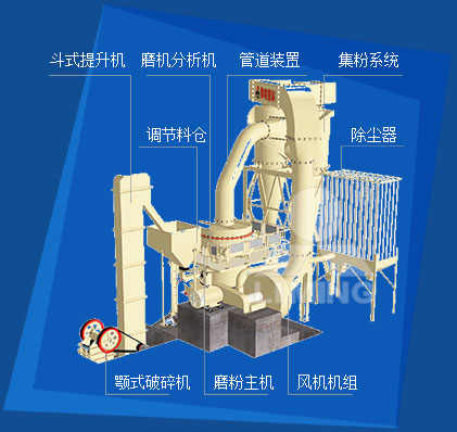 大塊非金屬礦經(jīng)顎式破碎機(jī)破碎后,由斗式提升機(jī)送至儲(chǔ)料倉(cāng),通過(guò)電磁振動(dòng)給料機(jī)均勻連續(xù)地送入磨粉機(jī)主機(jī)內(nèi)研磨,研磨后的粉末在鼓風(fēng)機(jī)的作用下吹向選粉機(jī)進(jìn)行分選。符合細(xì)度的非金屬礦粉由管道輸送到儲(chǔ)料倉(cāng);不合格的粒子重回磨粉機(jī)內(nèi)研磨。整個(gè)系統(tǒng)在負(fù)壓狀態(tài)下運(yùn)行,粉塵不外溢,從而保護(hù)了周邊環(huán)境。若經(jīng)脈沖除塵器過(guò)濾,環(huán)保效果更佳。