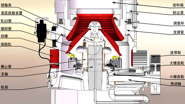 HPT液壓圓錐破碎機(jī)主要由機(jī)架部、支撐套部、調(diào)整環(huán)部、動(dòng)錐部、偏心套部、傳動(dòng)部和保險(xiǎn)裝置部七大部件組成,主軸固定,電動(dòng)機(jī)帶動(dòng)傳動(dòng)軸旋轉(zhuǎn),傳動(dòng)軸通過齒輪帶動(dòng)偏心套繞主軸旋轉(zhuǎn),再由偏心套帶動(dòng)動(dòng)錐部做偏心圓周擺動(dòng),從而實(shí)現(xiàn)連續(xù)的擠壓破碎石塊。