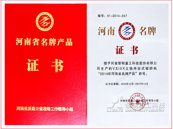 2015,羊年伊始,VSI5X斗志昂揚(yáng),斬獲“河南省名牌產(chǎn)品”稱號(hào),也是繼2014年摘得河南省科技進(jìn)步三等獎(jiǎng)后,又一次憑借硬實(shí)力成為眾人矚目的焦點(diǎn)。“名牌產(chǎn)品”由省質(zhì)量立省戰(zhàn)略工作領(lǐng)導(dǎo)小組進(jìn)行嚴(yán)格評(píng)審,經(jīng)過(guò)企業(yè)申報(bào)、資料審查、顧客滿意度調(diào)查、專家認(rèn)定、領(lǐng)導(dǎo)小組審定、公告等程序,在全省10個(gè)主要行業(yè)中評(píng)選出336個(gè)名牌產(chǎn)品,VSI5X立軸沖擊破成功入列。