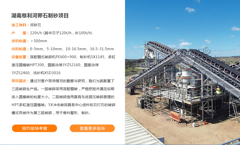 設備配置 : 深腔顎式破碎機PE600×900、制砂機5X1145、多缸液壓圓錐破HPT300、圓振動篩3YZS2160、圓振動篩3YZS2460、洗砂機XSD3016