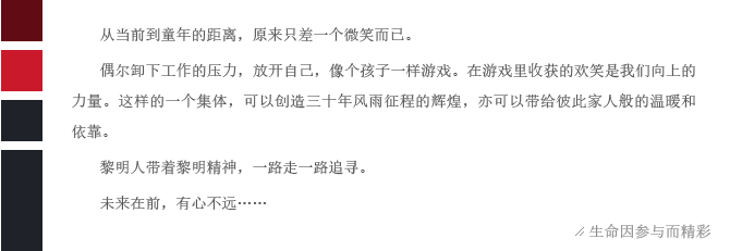 對(duì)運(yùn)動(dòng)會(huì)的憧憬,似乎斷在了畢業(yè)照的咔擦聲里。初入職場的你,每天在手忙腳亂里一點(diǎn)點(diǎn)褪去學(xué)生氣. 三年后的你, 工作節(jié)奏終于從容,激情卻隱在時(shí)光里;在職場馳騁過十年,白駒過隙里你嘆著氣恐懼著中年危機(jī)。是你嗎?不該是你!因?yàn)樵谶@里,青春,不畢業(yè)! 無數(shù)個(gè) 精彩瞬間 值得鐫刻 看起來些許幼稚的游戲卻讓一群人脫下工裝,如孩童般歡呼跳躍。和有趣的人一起做有趣的事,快樂從未這樣簡單過。 我的榮譽(yù)是 身旁 有你 是相遇的那份慶幸,讓彼此都活得盡興。 是你們,陪著我一起鬧,一起笑,一起忘掉不快,享受現(xiàn)在。