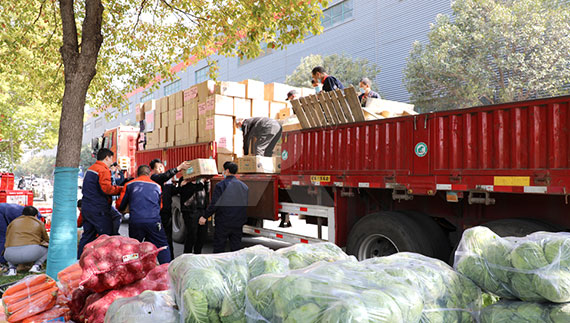 封控之下,臨港基地的生活物資和生產(chǎn)物資,都十分短缺。4 月初,黎明鄭州總部及時(shí)辦理好保供相關(guān)通行證,將新鮮時(shí)蔬、米面糧油等生活必需品分揀、裝箱、裝車,馳援浦東。
