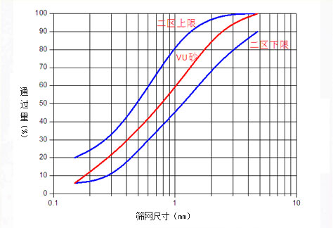 黎明VU砂石骨料系統(tǒng)能很好的將砂的級(jí)配曲線控制在級(jí)配二區(qū)里面,在采用相同水泥配制混凝土?xí)r,黎明VU砂石骨料優(yōu)化系統(tǒng)生產(chǎn)的機(jī)制砂能得到更高的強(qiáng)度,滿足各種混凝土及干混砂漿對(duì)砂的需求。