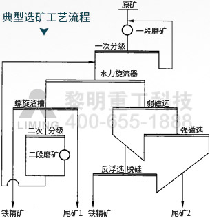 赤鐵礦選礦技術(shù) 赤鐵礦典型的選礦工藝流程有三種:連續(xù)磨礦―弱磁―強(qiáng)磁―陰離子反浮選、階段磨礦―粗細(xì)分選―重―磁―陰離子反浮選和階段磨礦―粗細(xì)分選―磁―重―陰離子反浮選。