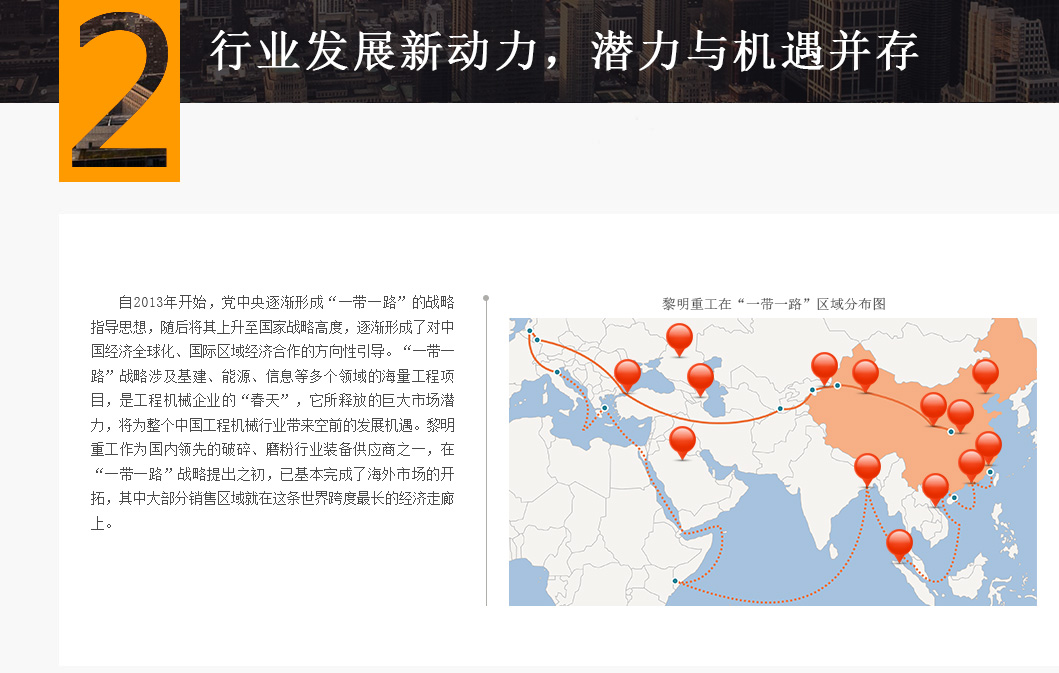 自2013年開始,黨中央逐漸形成“一帶一路倡議”的戰(zhàn)略指導(dǎo)思想,隨后將其上升至國家戰(zhàn)略高度,逐漸形成了對(duì)中國經(jīng)濟(jì)全球化、國際區(qū)域經(jīng)濟(jì)合作的方向性引導(dǎo)。“一帶一路倡議”戰(zhàn)略涉及基建、能源、信息等多個(gè)領(lǐng)域的海量工程項(xiàng)目,是工程機(jī)械企業(yè)的“春天”,它所釋放的巨大市場潛力,將為整個(gè)中國工程機(jī)械行業(yè)帶來發(fā)展機(jī)遇。黎明重工作為國內(nèi)知名的破碎、磨粉行業(yè)裝備供應(yīng)商之一,在“一帶一路倡議”戰(zhàn)略提出之初,已基本完成了海外市場的開拓,其中大部分銷售區(qū)域就在這條世界跨度最長的經(jīng)濟(jì)走廊上。